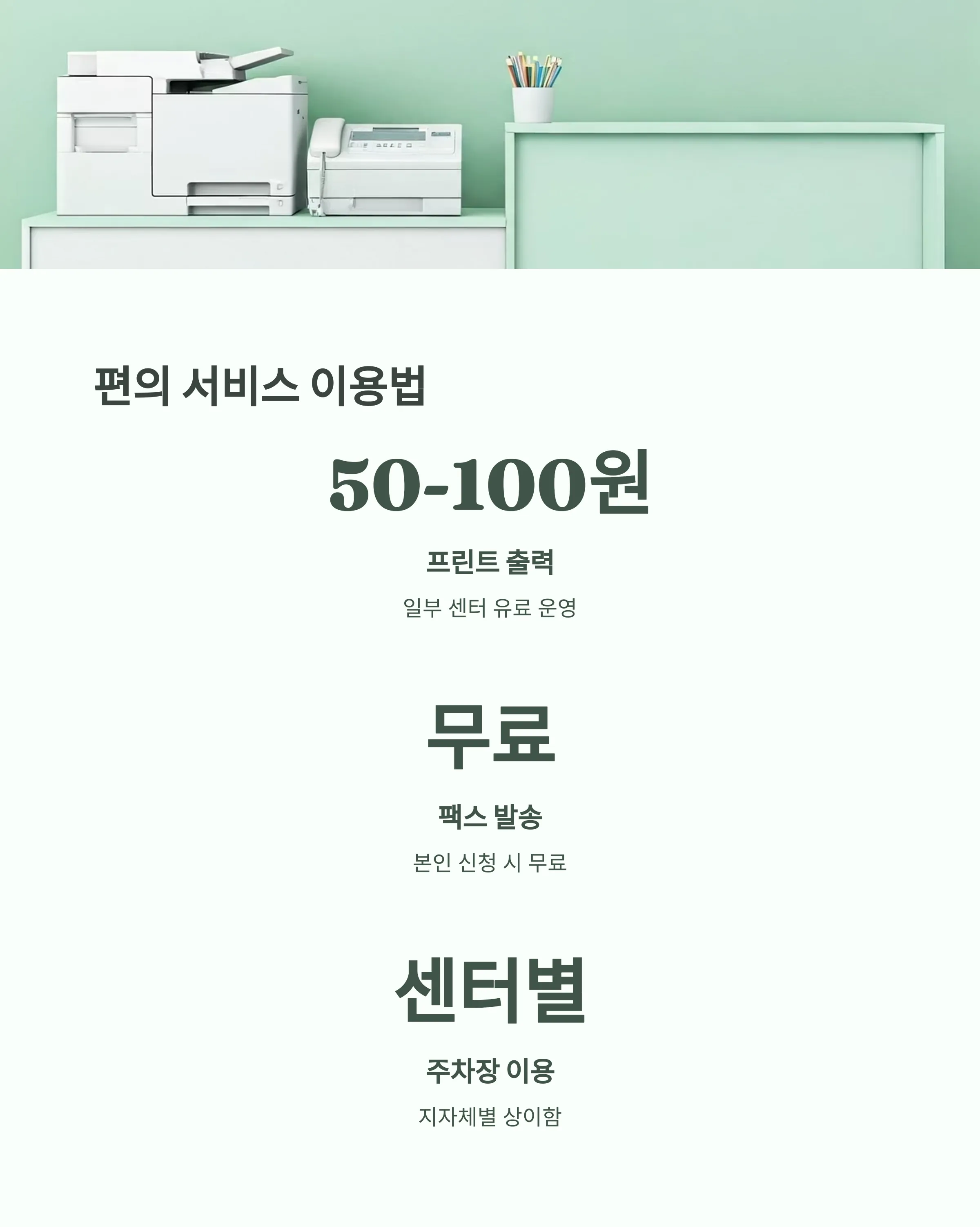 - 🚗 주차 및 프린트·팩스 서비스는 센터별로 상이