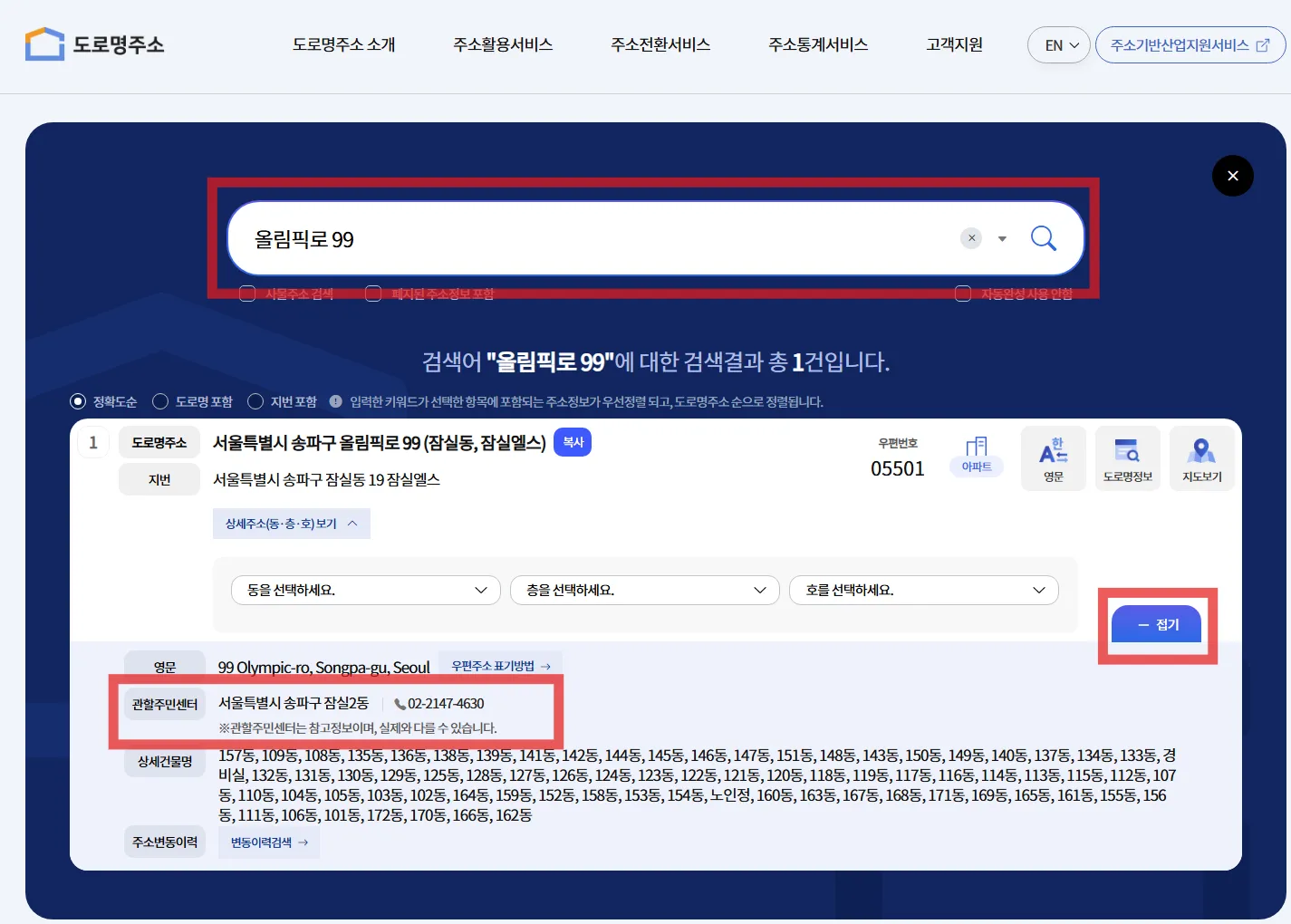 3️⃣ 검색 결과 하단 '+접기' 클릭 → 관할 주민센터 확인하시면 됩니다.