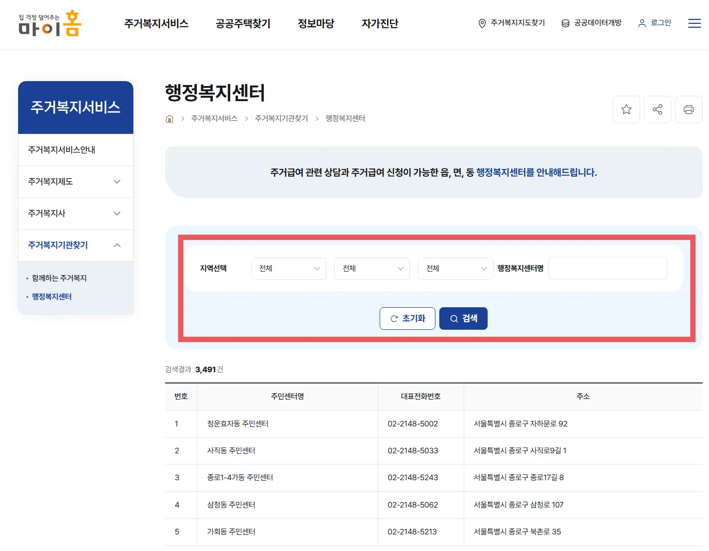 2️⃣ ‘주거복지기관 찾기’ → ‘행정복지센터’ 선택